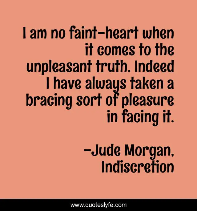 This page presents the quote "I am no faint-heart when it comes to the unpleasant truth. Indeed I have always taken a bracing sort of pleasure in facing it.". Author of this quote is Jude Morgan, Indiscretion. This quote is about lies, truth,.