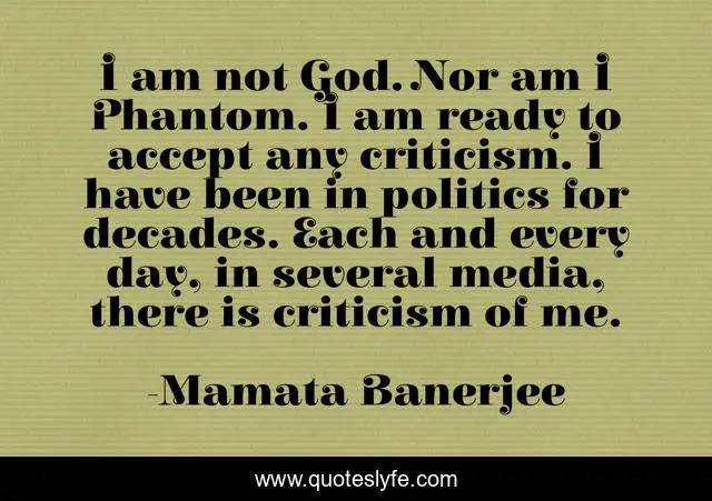 This page presents the quote "I am not God. Nor am I Phantom. I am ready to accept any criticism. I have been in politics for decades. Each and every day, in several media, there is criticism of me.". Author of this quote is Mamata Banerjee. This quote is about god, day,.