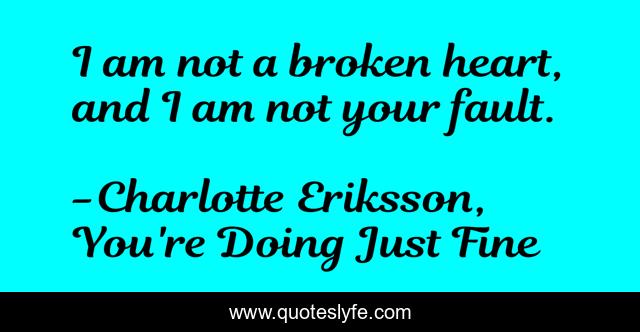 This page presents the quote "I am not a broken heart, and I am not your fault.". Author of this quote is Charlotte Eriksson, You're Doing Just Fine. This quote is about broken-heart, heartache, moving-on, love, recovery, heart, fault, i-am, acceptance,.