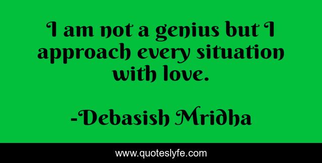 This page presents the quote "I am not a genius but I approach every situation with love.". Author of this quote is Debasish Mridha. This quote is about life, love, knowledge, inspirational, intelligence, philosophy, wisdom, quotes, affection,.
