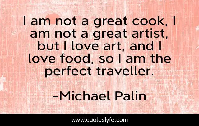 This page presents the quote "I am not a great cook, I am not a great artist, but I love art, and I love food, so I am the perfect traveller.". Author of this quote is Michael Palin. This quote is about love, travel, art, affection,.