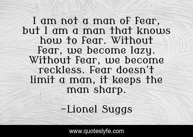 This page presents the quote "I am not a man of fear, but I am a man that knows how to fear. Without fear, we become lazy. Without fear, we become reckless. Fear doesn't limit a man, it keeps the man sharp.". Author of this quote is Lionel Suggs. .