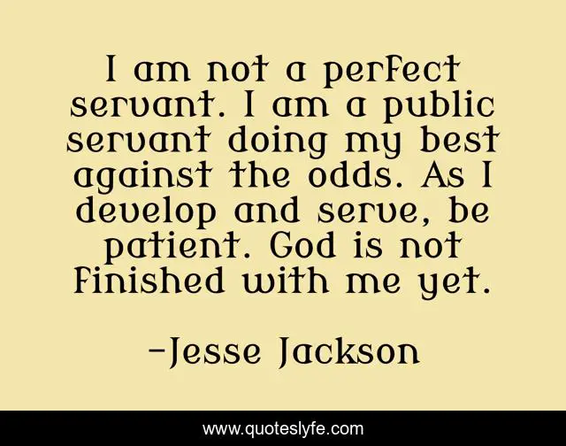 This page presents the quote "I am not a perfect servant. I am a public servant doing my best against the odds. As I develop and serve, be patient. God is not finished with me yet.". Author of this quote is Jesse Jackson. This quote is about god, best,.