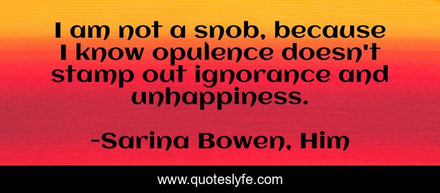 This page presents the quote "I am not a snob, because I know opulence doesn't stamp out ignorance and unhappiness.". Author of this quote is Sarina Bowen, Him. This quote is about human-nature, stupidity, simple-minds,.