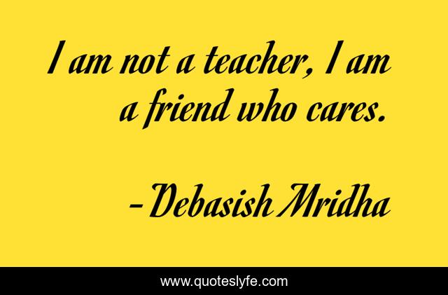 This page presents the quote "I am not a teacher, I am a friend who cares.". Author of this quote is Debasish Mridha. This quote is about care, life, love, knowledge, inspirational, intelligence, philosophy, wisdom, friend,.