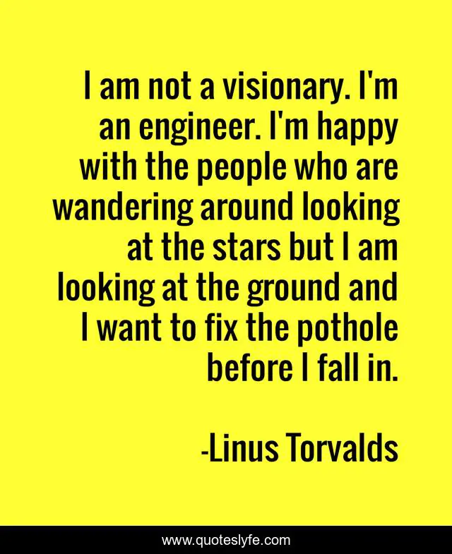 This page presents the quote "I am not a visionary. I'm an engineer. I'm happy with the people who are wandering around looking at the stars but I am looking at the ground and I want to fix the pothole before I fall in.". Author of this quote is Linus Torvalds. .