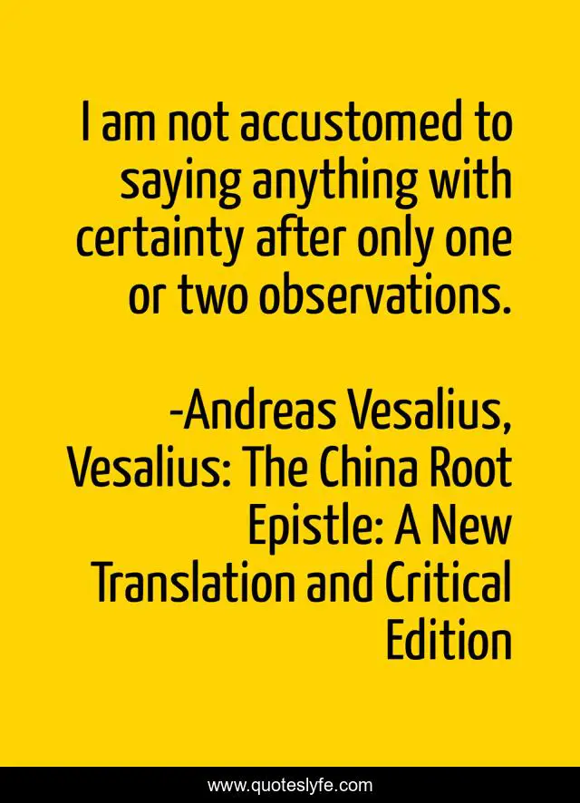 This page presents the quote "I am not accustomed to saying anything with certainty after only one or two observations.". Author of this quote is Andreas Vesalius, Vesalius: The China Root Epistle: A New Translation and Critical Edition. This quote is about skepticism, doubt, certainty, observation,.