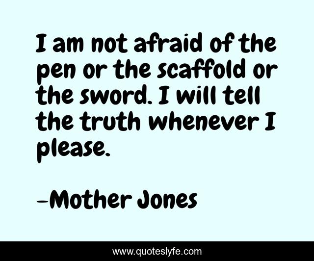 This page presents the quote "I am not afraid of the pen or the scaffold or the sword. I will tell the truth whenever I please.". Author of this quote is Mother Jones. .