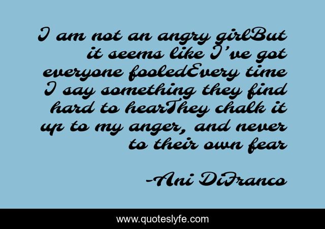 This page presents the quote "I am not an angry girlBut it seems like I’ve got everyone fooledEvery time I say something they find hard to hearThey chalk it up to my anger, and never to their own fear". Author of this quote is Ani DiFranco. .