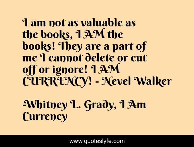 This page presents the quote "I am not as valuable as the books, I AM the books! They are a part of me I cannot delete or cut off or ignore! I AM CURRENCY! - Nevel Walker". Author of this quote is Whitney L. Grady, I Am Currency. This quote is about young-adult-fiction, fiction,.