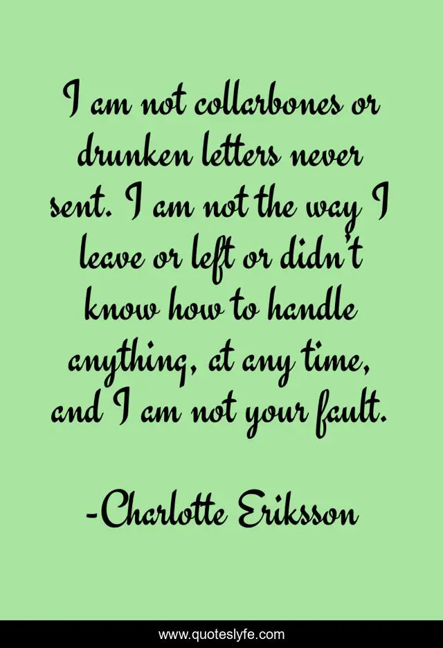 This page presents the quote "I am not collarbones or drunken letters never sent. I am not the way I leave or left or didn’t know how to handle anything, at any time, and I am not your fault.". Author of this quote is Charlotte Eriksson. This quote is about prose-poetry, letters, lost-love, drunk, charlotte-eriksson, poetry, leaving, leave, break-up,.