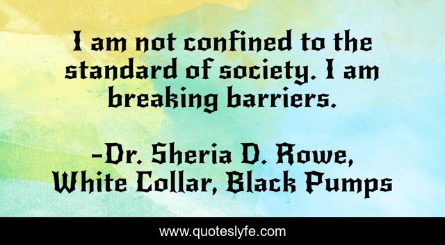 This page presents the quote "I am not confined to the standard of society. I am breaking barriers.". Author of this quote is Dr. Sheria D. Rowe, White Collar, Black Pumps. This quote is about positive, confidence, motivational, optimistic,.