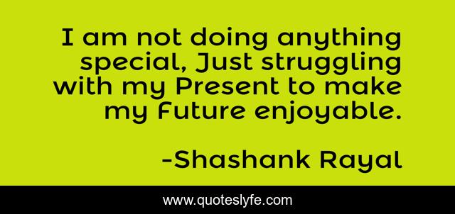 This page presents the quote "I am not doing anything special, Just struggling with my Present to make my Future enjoyable.". Author of this quote is Shashank Rayal. This quote is about confidence, positive, motivational, behaviour, attitude, future, struggle, inspirational, enthusiasm,.