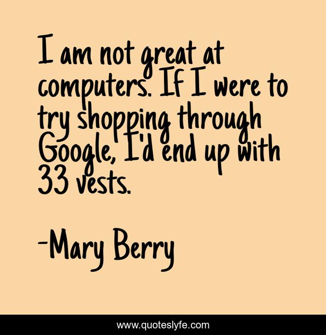 This page presents the quote "I am not great at computers. If I were to try shopping through Google, I'd end up with 33 vests.". Author of this quote is Mary Berry. This quote is about great, end,.