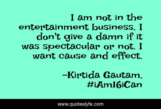 This page presents the quote "I am not in the entertainment business. I don't give a damn if it was spectacular or not. I want cause and effect.". Author of this quote is Kirtida Gautam, #iAm16iCan. This quote is about media, parenting, rudransh-kashyap, inspirational, enthusiasm,.