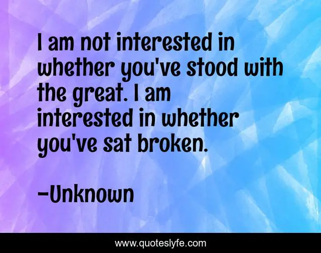 This page presents the quote "I am not interested in whether you've stood with the great. I am interested in whether you've sat broken.". Author of this quote is Unknown. This quote is about beauty-in-brokeness, empathy, love, compassion, stories-from-the-heart, adventure-in-inconvenience, affection,.