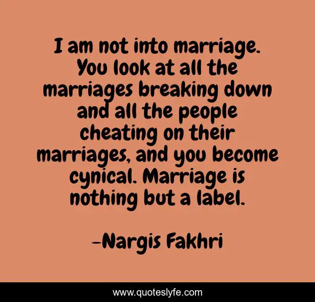This page presents the quote "I am not into marriage. You look at all the marriages breaking down and all the people cheating on their marriages, and you become cynical. Marriage is nothing but a label.". Author of this quote is Nargis Fakhri. This quote is about cheating, people,.