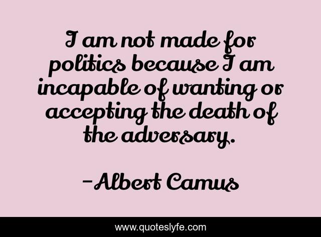 This page presents the quote "I am not made for politics because I am incapable of wanting or accepting the death of the adversary.". Author of this quote is Albert Camus. This quote is about wanting, politics,.