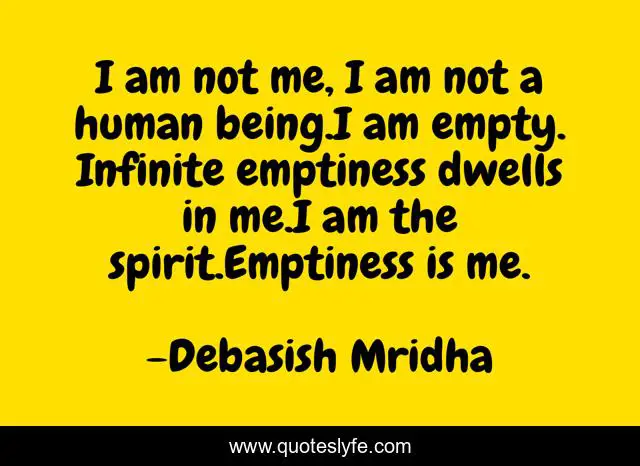 This page presents the quote "I am not me, I am not a human being.I am empty. Infinite emptiness dwells in me.I am the spirit.Emptiness is me.". Author of this quote is Debasish Mridha. This quote is about emptiness-is-me, debasish, infinite-emptiness, mridha, i-am-empty, philosophy, debasish-mridha, i-am-the-spirit,.