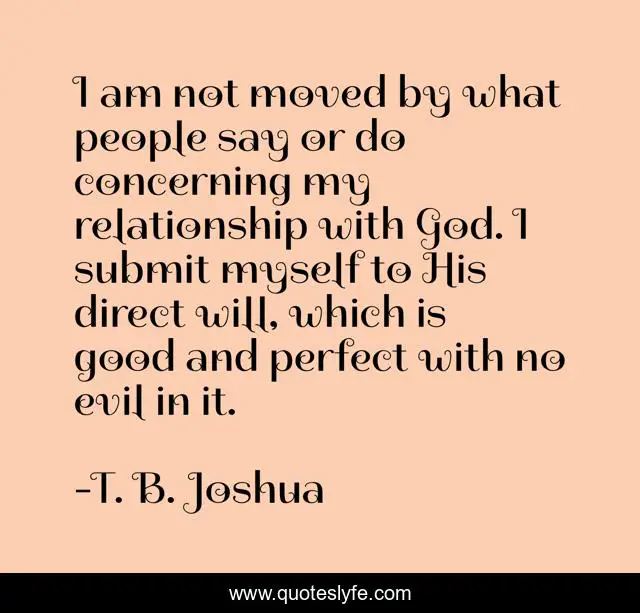 This page presents the quote "I am not moved by what people say or do concerning my relationship with God. I submit myself to His direct will, which is good and perfect with no evil in it.". Author of this quote is T. B. Joshua. This quote is about myself, good, evil,.