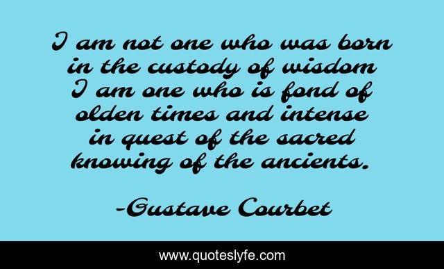 This page presents the quote "I am not one who was born in the custody of wisdom I am one who is fond of olden times and intense in quest of the sacred knowing of the ancients.". Author of this quote is Gustave Courbet. This quote is about knowing, born,.