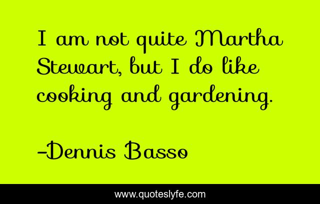 This page presents the quote "I am not quite Martha Stewart, but I do like cooking and gardening.". Author of this quote is Dennis Basso. This quote is about cooking, like,.