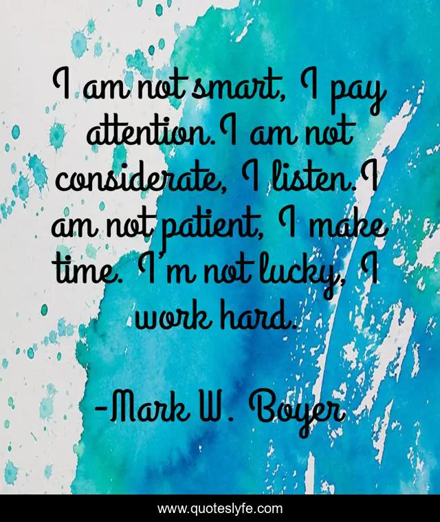 This page presents the quote "I am not smart, I pay attention.I am not considerate, I listen.I am not patient, I make time. I’m not lucky, I work hard.". Author of this quote is Mark W. Boyer. This quote is about confidence, positive, motivational, training-and-development, work-ethic, optimistic, inspirational, consideration, enthusiasm,.