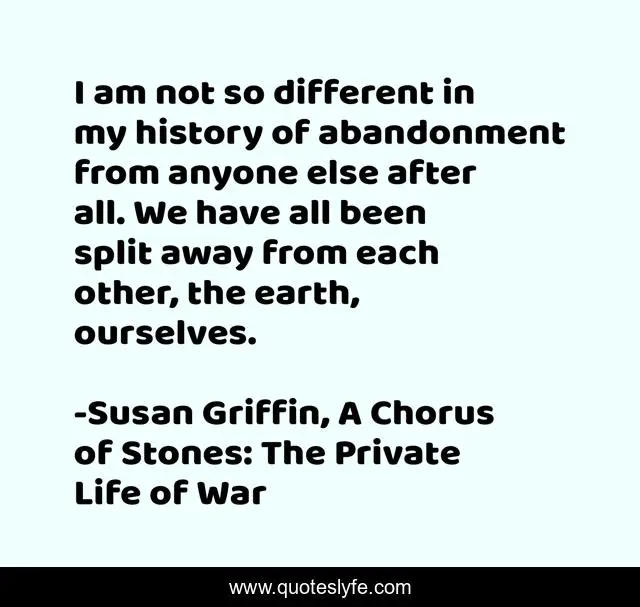 This page presents the quote "I am not so different in my history of abandonment from anyone else after all. We have all been split away from each other, the earth, ourselves.". Author of this quote is Susan Griffin, A Chorus of Stones: The Private Life of War. This quote is about abandonement, split, history,.
