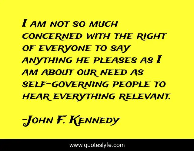 This page presents the quote "I am not so much concerned with the right of everyone to say anything he pleases as I am about our need as self-governing people to hear everything relevant.". Author of this quote is John F. Kennedy. This quote is about liberty, human, rights,.