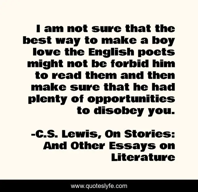 This page presents the quote "I am not sure that the best way to make a boy love the English poets might not be forbid him to read them and then make sure that he had plenty of opportunities to disobey you.". Author of this quote is C.S. Lewis, On Stories: And Other Essays on Literature. This quote is about teaching, leadership, education, forbidden-fruit, enticement,.