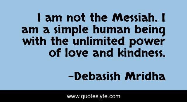 This page presents the quote "I am not the Messiah. I am a simple human being with the unlimited power of love and kindness.". Author of this quote is Debasish Mridha. This quote is about unlimited-power, love-and-kindness, simple-human-being, philosophy, debasish-mridha, quotes, debasish-mridha-md, inspirational, enthusiasm,.