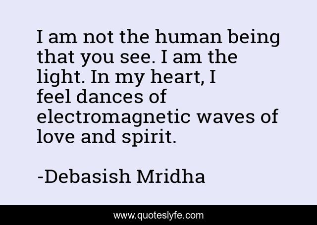 This page presents the quote "I am not the human being that you see. I am the light. In my heart, I feel dances of electromagnetic waves of love and spirit.". Author of this quote is Debasish Mridha. This quote is about miraboli, oscar-wilde, philosophy, debasish-mridha, human-being-as-energy, quotes, buddha, debasish-mridha-md, inspirational,.