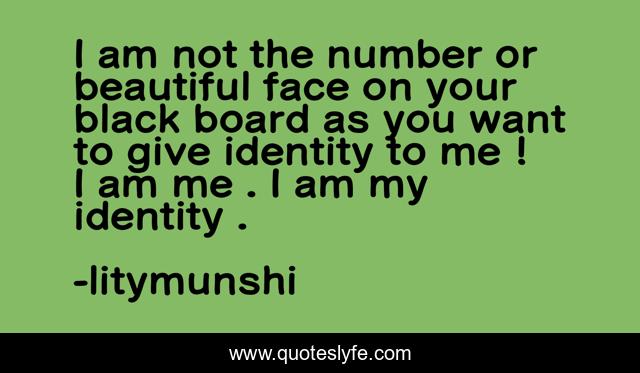 This page presents the quote "I am not the number or beautiful face on your black board as you want to give identity to me ! I am me . I am my identity .". Author of this quote is litymunshi. This quote is about love, name, society, dominating, identity, care, affection, women,.