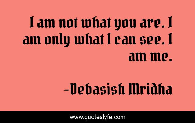This page presents the quote "I am not what you are. I am only what I can see. I am me.". Author of this quote is Debasish Mridha. This quote is about profound-thought, i-am-me, philosophy, debasish-mridha, debasish-mridha-m-d, quotes, inspirational, who-am-i, enthusiasm,.