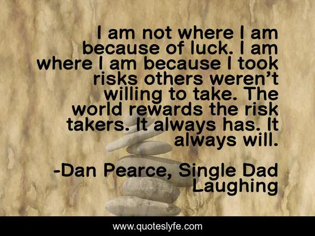 This page presents the quote "I am not where I am because of luck. I am where I am because I took risks others weren’t willing to take. The world rewards the risk takers. It always has. It always will.". Author of this quote is Dan Pearce, Single Dad Laughing. This quote is about taking-risks, achievement, risk-vs-reward, luck,.