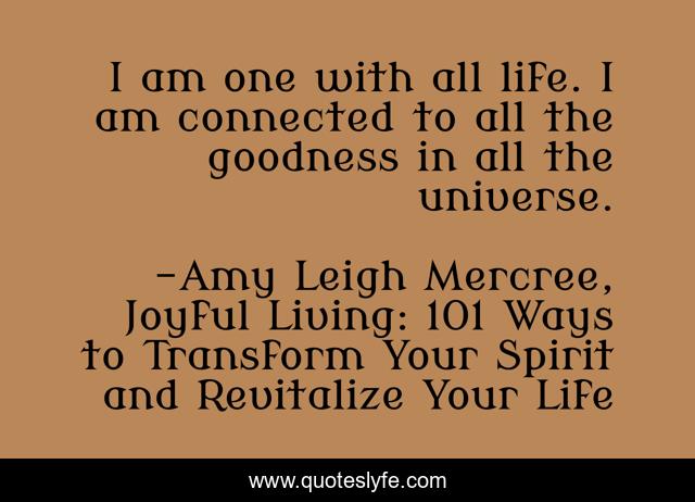 This page presents the quote "I am one with all life. I am connected to all the goodness in all the universe.". Author of this quote is Amy Leigh Mercree, Joyful Living: 101 Ways to Transform Your Spirit and Revitalize Your Life. This quote is about life, quotes-de-la-vida, amy-leigh-mercree, quote-of-the-day, quote-about-life, joyful-living, quotes-tumblr, joyful-living-101, inspirational,.