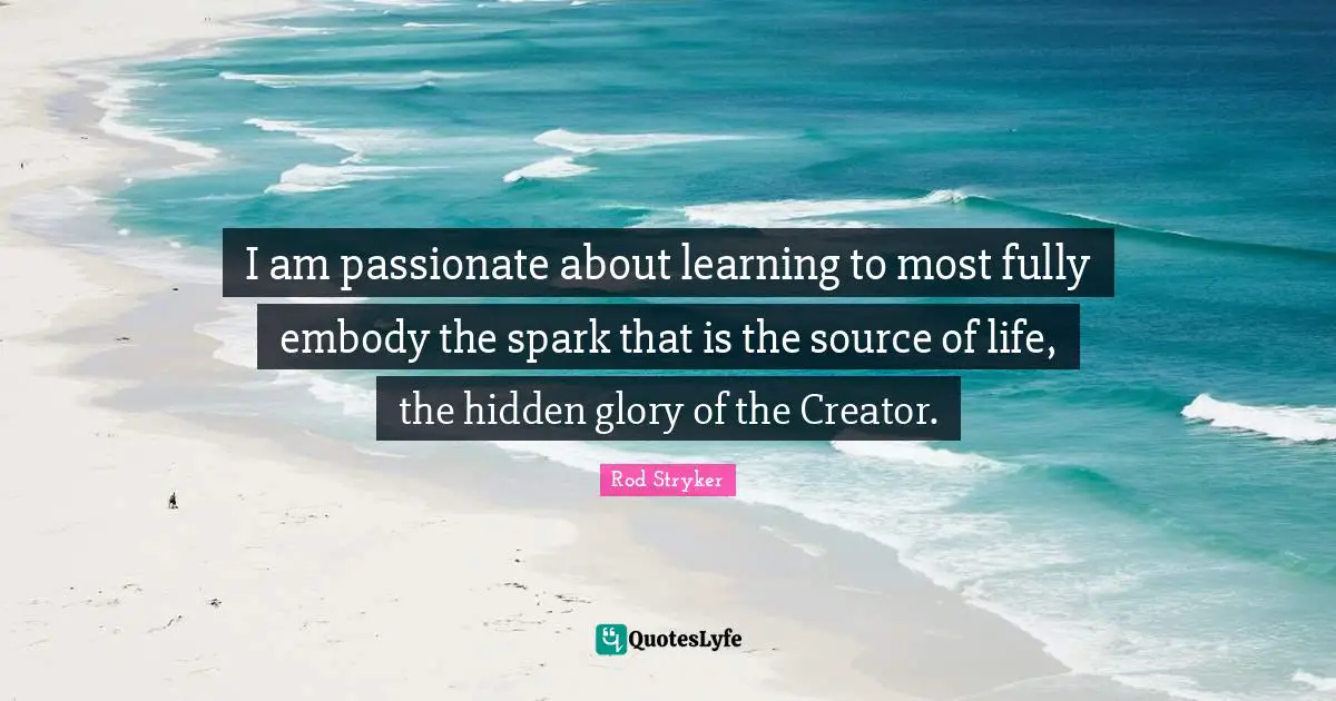 This page presents the quote "I am passionate about learning to most fully embody the spark that is the source of life, the hidden glory of the Creator.". Author of this quote is Rod Stryker. This quote is about sparks, creator, learning, passionate, source of life, glory,.