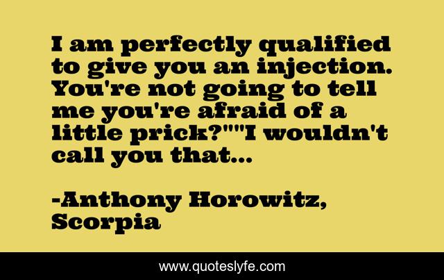This page presents the quote "I am perfectly qualified to give you an injection. You're not going to tell me you're afraid of a little prick?""I wouldn't call you that...". Author of this quote is Anthony Horowitz, Scorpia. .
