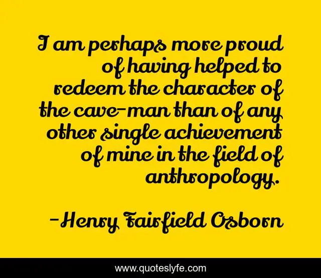 This page presents the quote "I am perhaps more proud of having helped to redeem the character of the cave-man than of any other single achievement of mine in the field of anthropology.". Author of this quote is Henry Fairfield Osborn. This quote is about achievements, biology, science, character, evolution, anthropology, cave-man, human-evolution,.