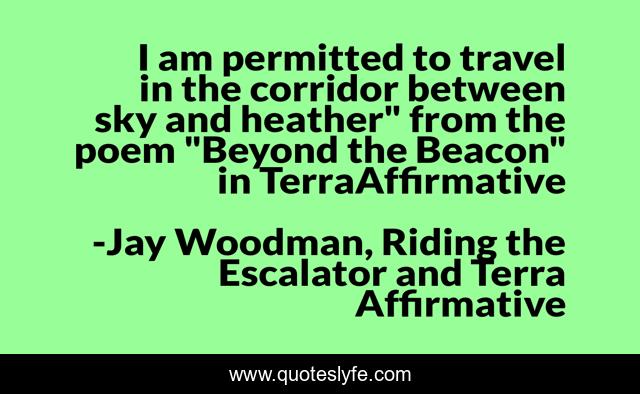 This page presents the quote "I am permitted to travel in the corridor between sky and heather" from the poem "Beyond the Beacon" in TerraAffirmative". Author of this quote is Jay Woodman, Riding the Escalator and Terra Affirmative. This quote is about heather, beyond, sky, terra-affirmative,.