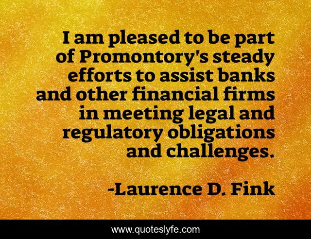 This page presents the quote "I am pleased to be part of Promontory's steady efforts to assist banks and other financial firms in meeting legal and regulatory obligations and challenges.". Author of this quote is Laurence D. Fink. This quote is about challenges, financial,.