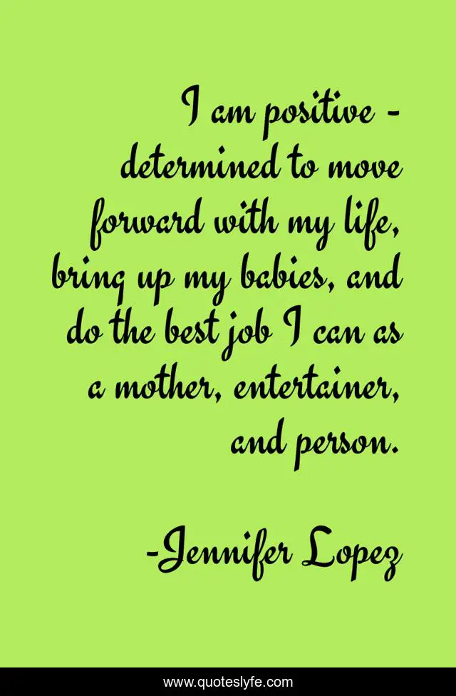 This page presents the quote "I am positive - determined to move forward with my life, bring up my babies, and do the best job I can as a mother, entertainer, and person.". Author of this quote is Jennifer Lopez. This quote is about life, best, mother,.