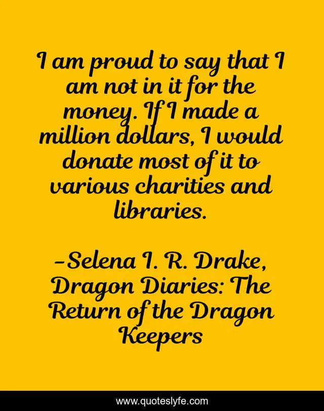 This page presents the quote "I am proud to say that I am not in it for the money. If I made a million dollars, I would donate most of it to various charities and libraries.". Author of this quote is Selena I. R. Drake, Dragon Diaries: The Return of the Dragon Keepers. This quote is about libraries, money, charities, honesty,.