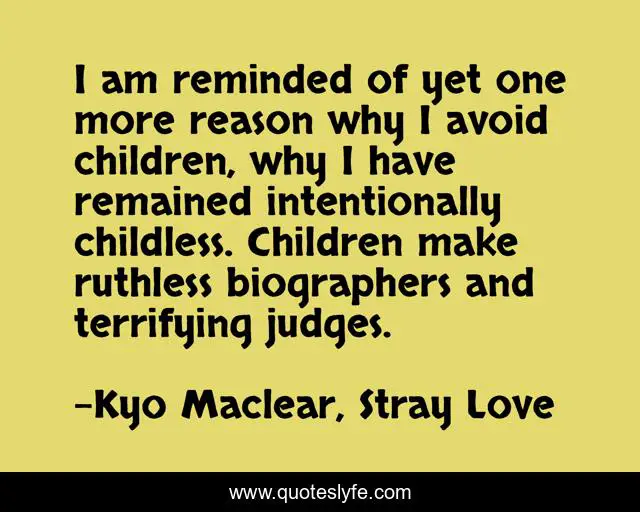 This page presents the quote "I am reminded of yet one more reason why I avoid children, why I have remained intentionally childless. Children make ruthless biographers and terrifying judges.". Author of this quote is Kyo Maclear, Stray Love. .