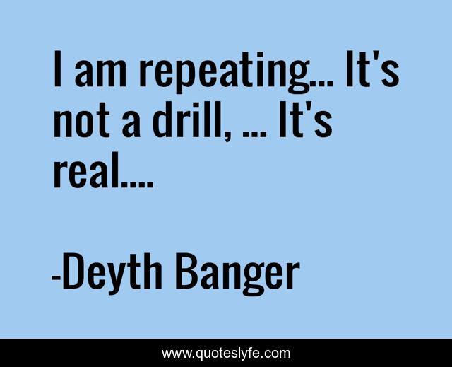 This page presents the quote "I am repeating... It's not a drill, ... It's real....". Author of this quote is Deyth Banger. This quote is about real, repeat, drill,.