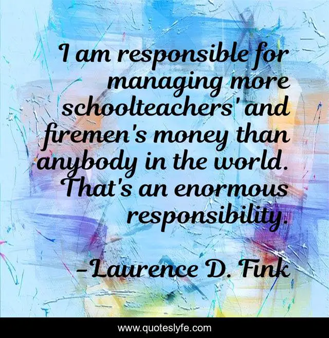 This page presents the quote "I am responsible for managing more schoolteachers' and firemen's money than anybody in the world. That's an enormous responsibility.". Author of this quote is Laurence D. Fink. This quote is about world, responsibility,.