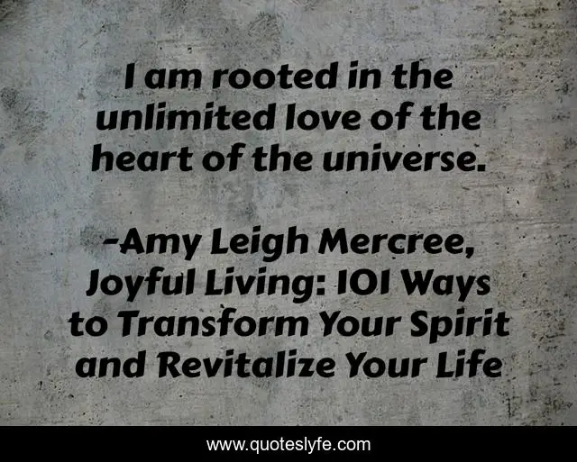 This page presents the quote "I am rooted in the unlimited love of the heart of the universe.". Author of this quote is Amy Leigh Mercree, Joyful Living: 101 Ways to Transform Your Spirit and Revitalize Your Life. This quote is about life, quotes-de-la-vida, unlimited-love, quote-of-the-day, quotes-for-instagram, amy-leigh-mercree, joyful-living, quotes-tumblr, joyful-living-101,.