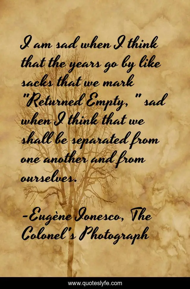 This page presents the quote "I am sad when I think that the years go by like sacks that we mark "Returned Empty, " sad when I think that we shall be separated from one another and from ourselves.". Author of this quote is Eugène Ionesco, The Colonel's Photograph. This quote is about loss, time-passing,.