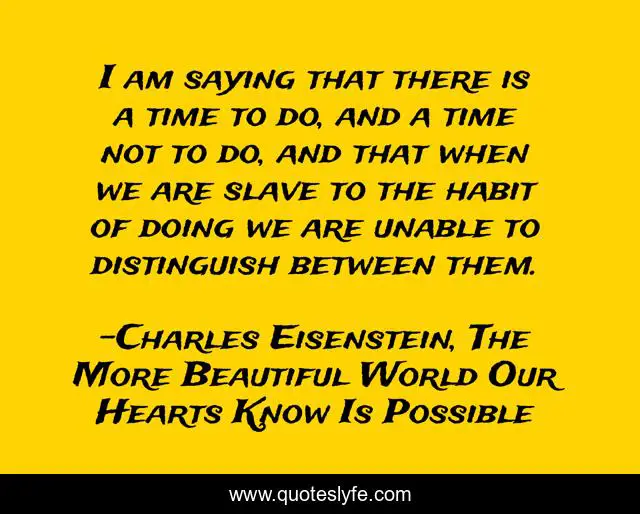 This page presents the quote "I am saying that there is a time to do, and a time not to do, and that when we are slave to the habit of doing we are unable to distinguish between them.". Author of this quote is Charles Eisenstein, The More Beautiful World Our Hearts Know Is Possible. This quote is about sacred-wisdom, activism, humanity, sacred-teachings,.
