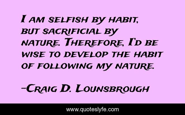This page presents the quote "I am selfish by habit, but sacrificial by nature. Therefore, I’d be wise to develop the habit of following my nature.". Author of this quote is Craig D. Lounsbrough. This quote is about sacrificial, give, habitual, selflessness, selfishness, tendency, narcissistic, selfish, generous,.